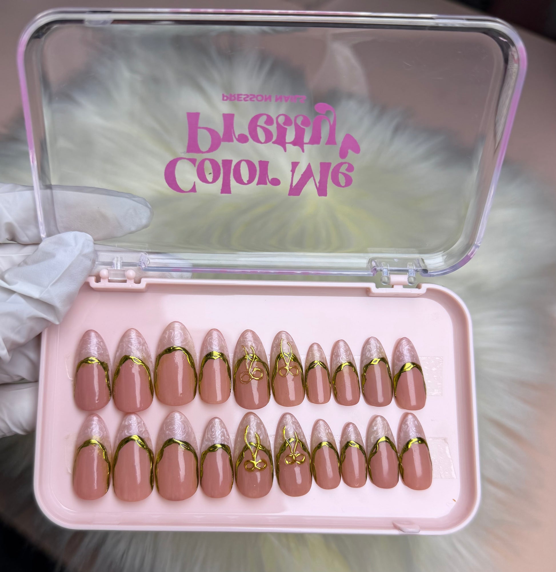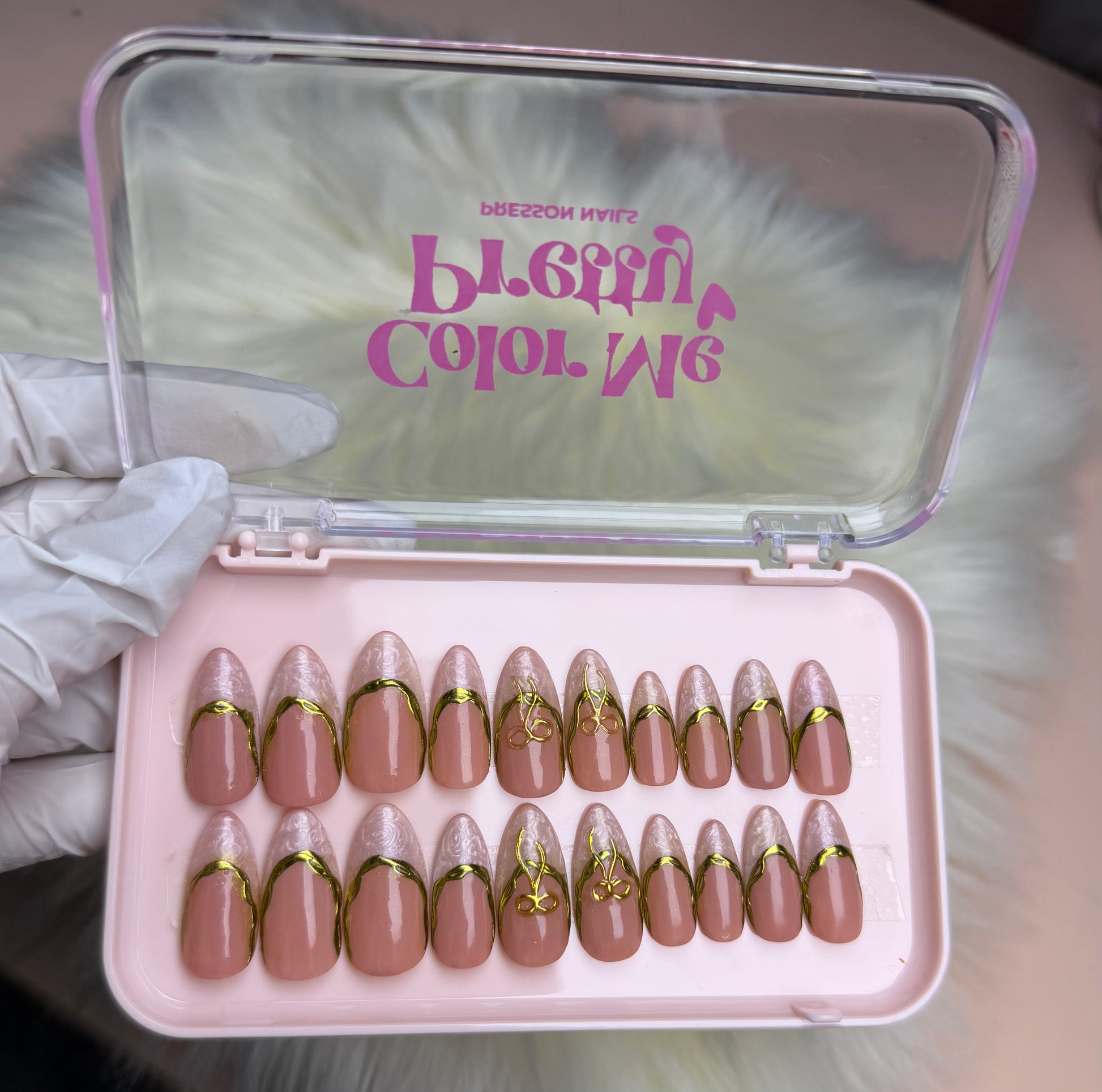 This radiant chrome set blends soft champagne hues with a high-shine metallic finish. Expertly buffed to achieve a mirror-like effect, these nails glow effortlessly under light. Perfect for parties, weddings, and celebrations that call for subtle glamour and elegance.
