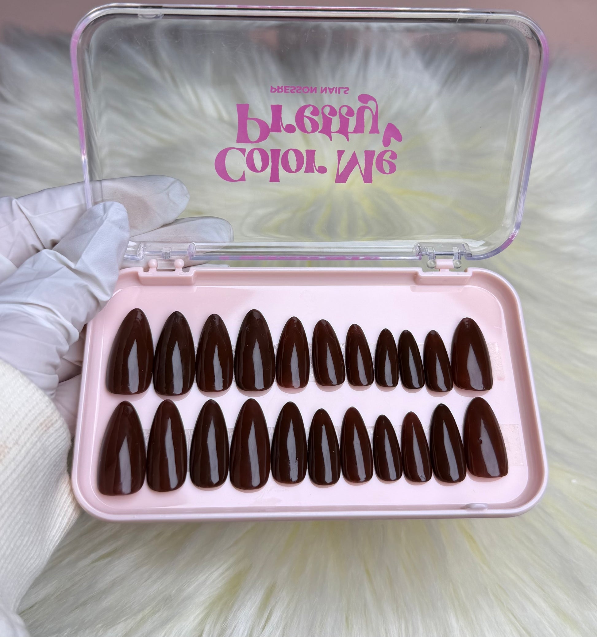 Chocolate Garnet Nail is a rich, deep-toned solid set that blends the warmth of cocoa with the elegance of garnet wine hues. Finished with a high-gloss polish, this design highlights precise shaping and smooth application for a bold yet timeless look. Perfect for evening wear or everyday luxury, it reflects refined craftsmanship and flawless detailing.