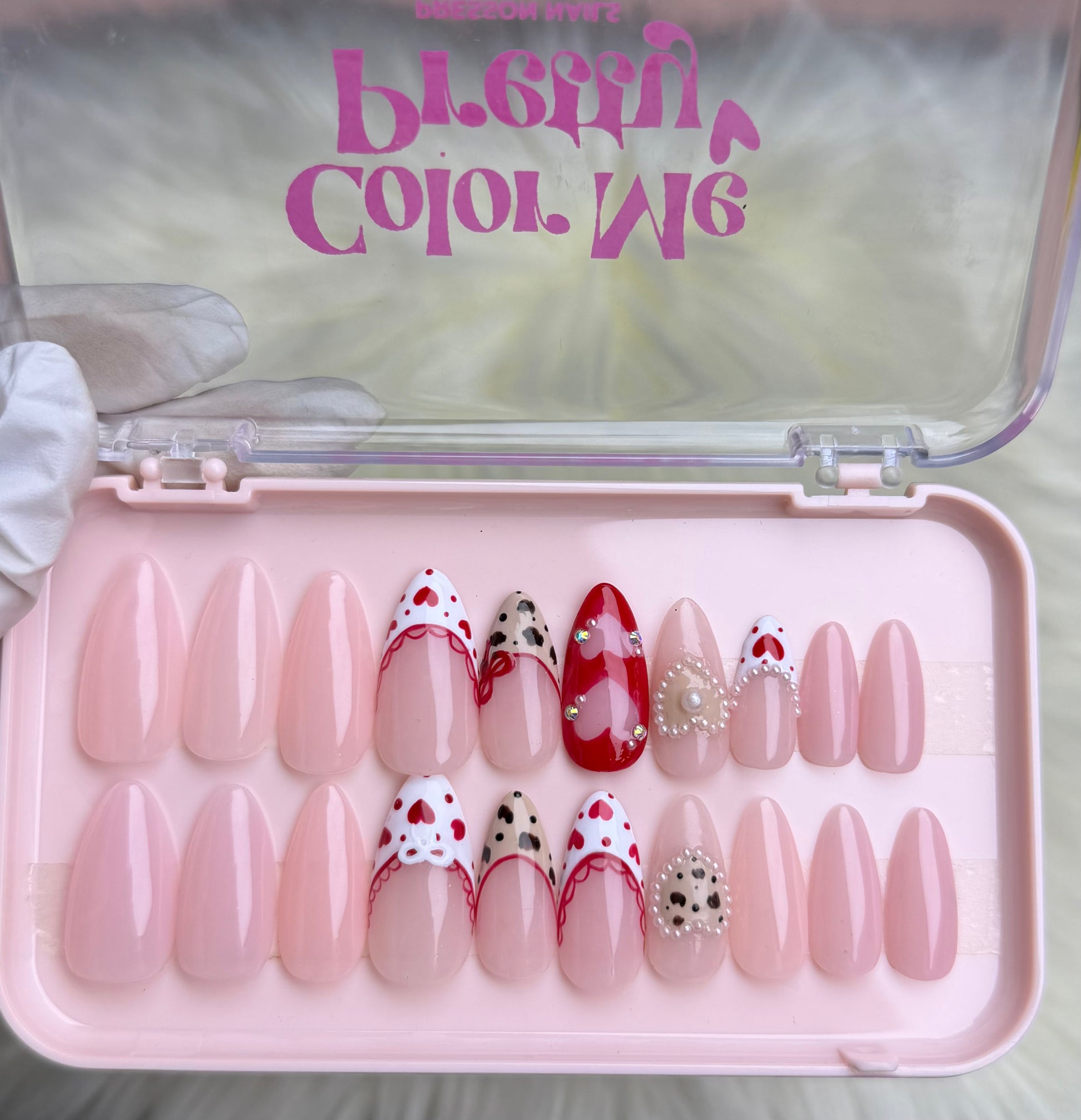 Cupid lace nails are a romantic blend of soft blush tones, delicate lace-inspired French tips, playful polka dots, and hand-painted heart accents. Designed to feel flirty yet elegant, this set captures modern romance with a sweet, couture twist—perfect for date nights, bridal moments, or love-core aesthetics.