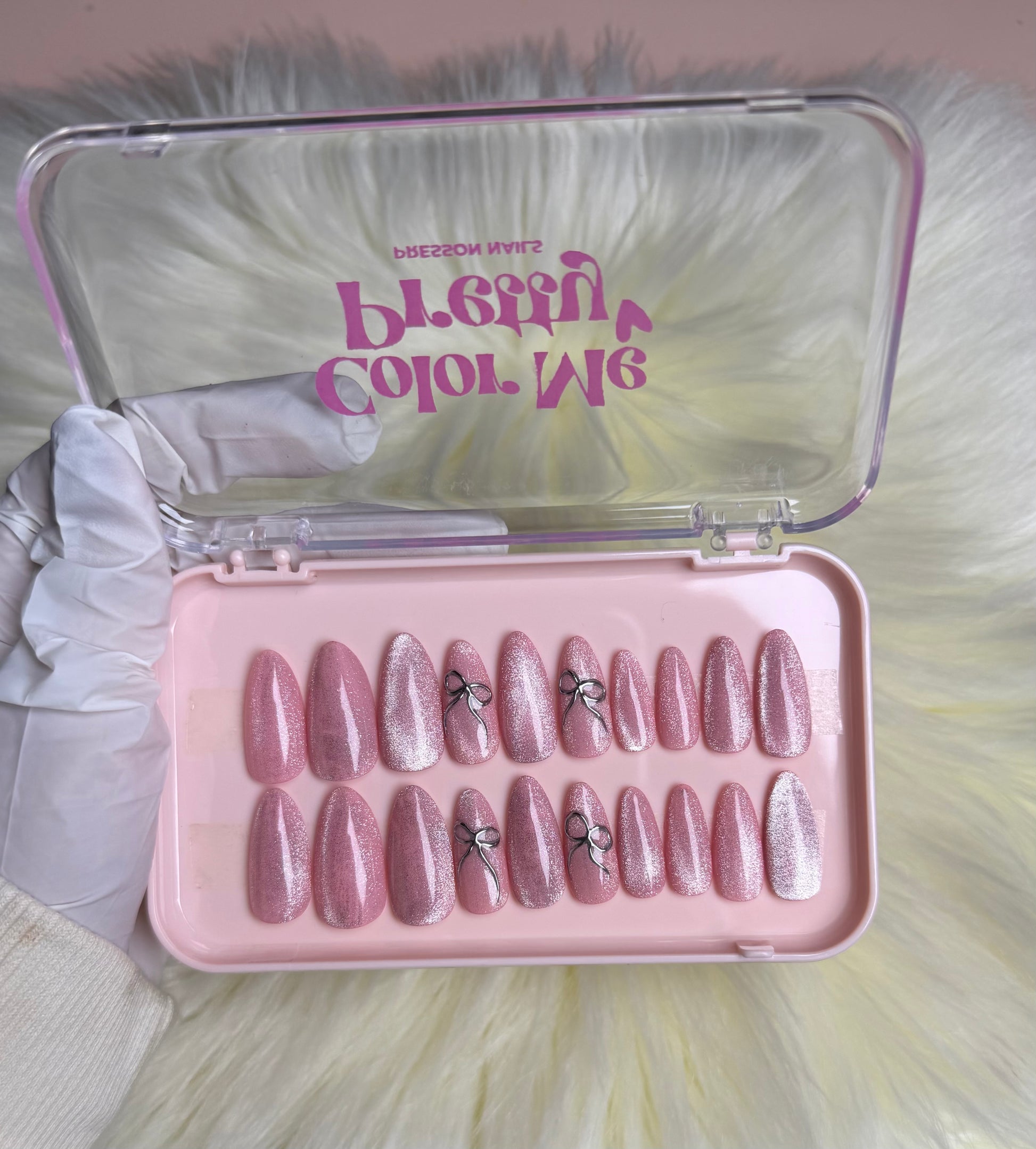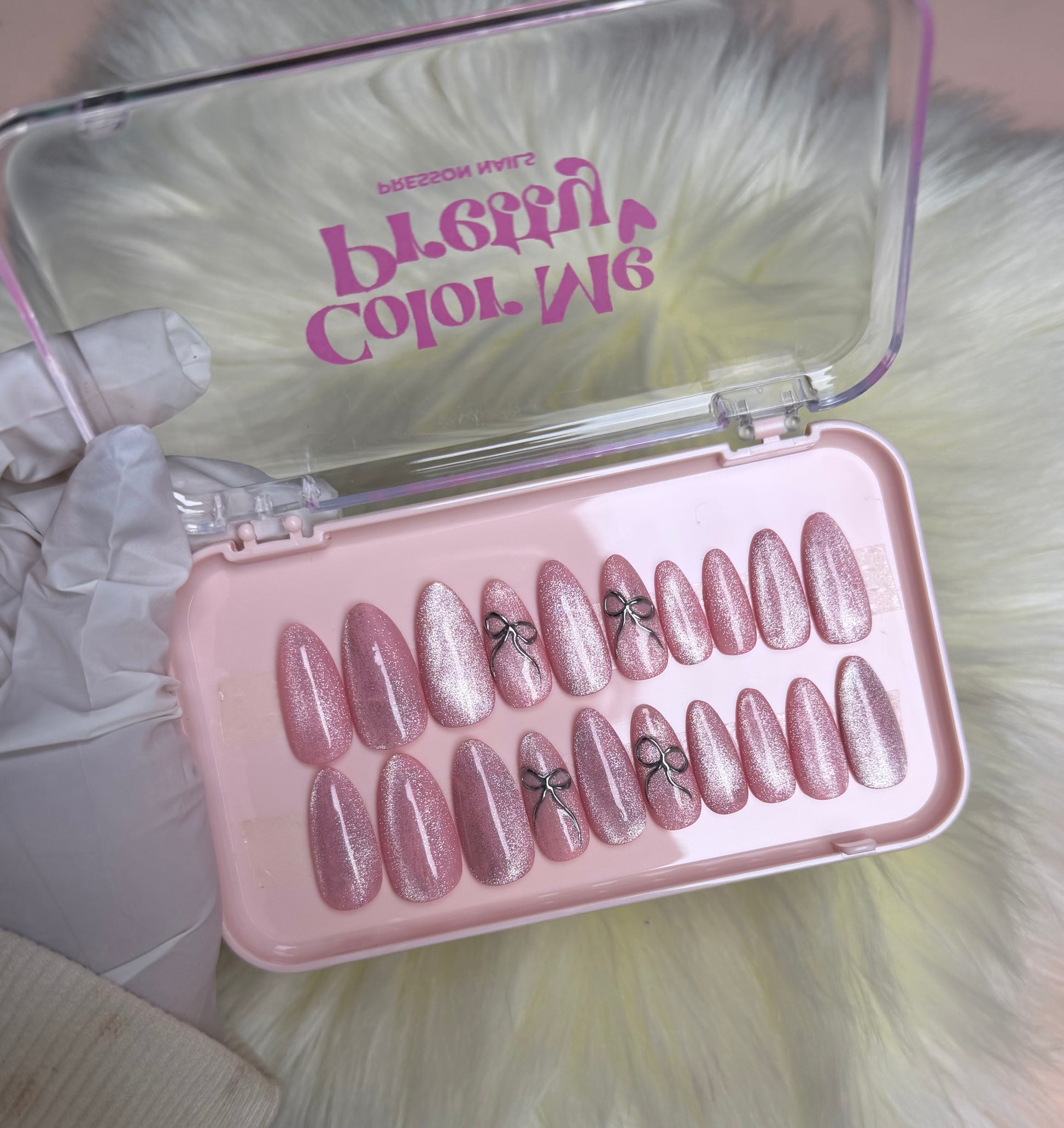 This enchanting set combines shimmering cat-eye polish with delicate 3D bow accents. The magnetic effect creates depth and movement, while bows add a fairy-core charm. Crafted with precision and balance, these nails sparkle subtly, perfect for playful yet elegant aesthetics.
