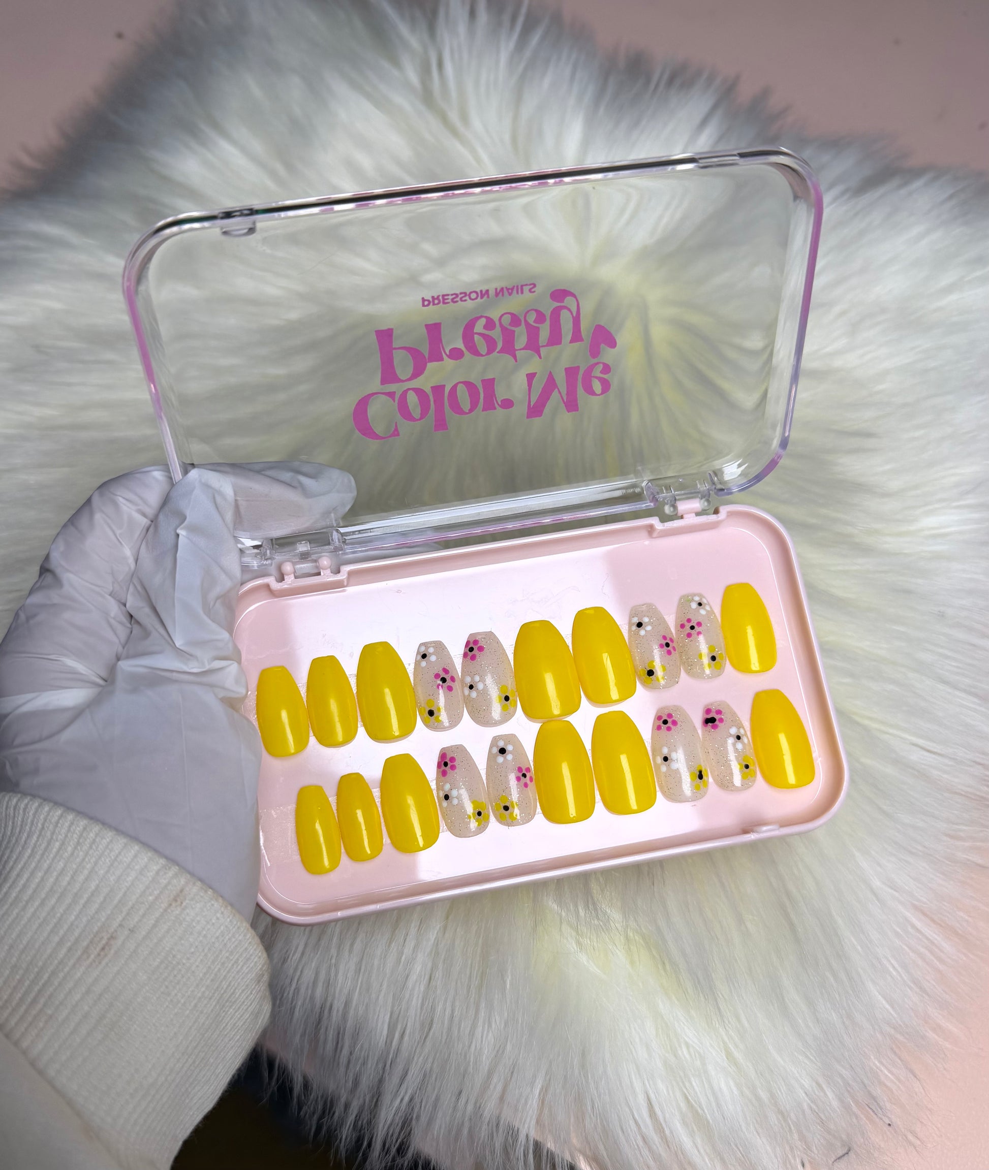 Inspired by traditional haldi ceremonies, this vibrant set captures joy through warm hues and delicate petal detailing. Handcrafted floral elements bring a festive charm, while the smooth base ensures comfort and wearability. A celebration-ready design blending cultural beauty with refined nail artistry.