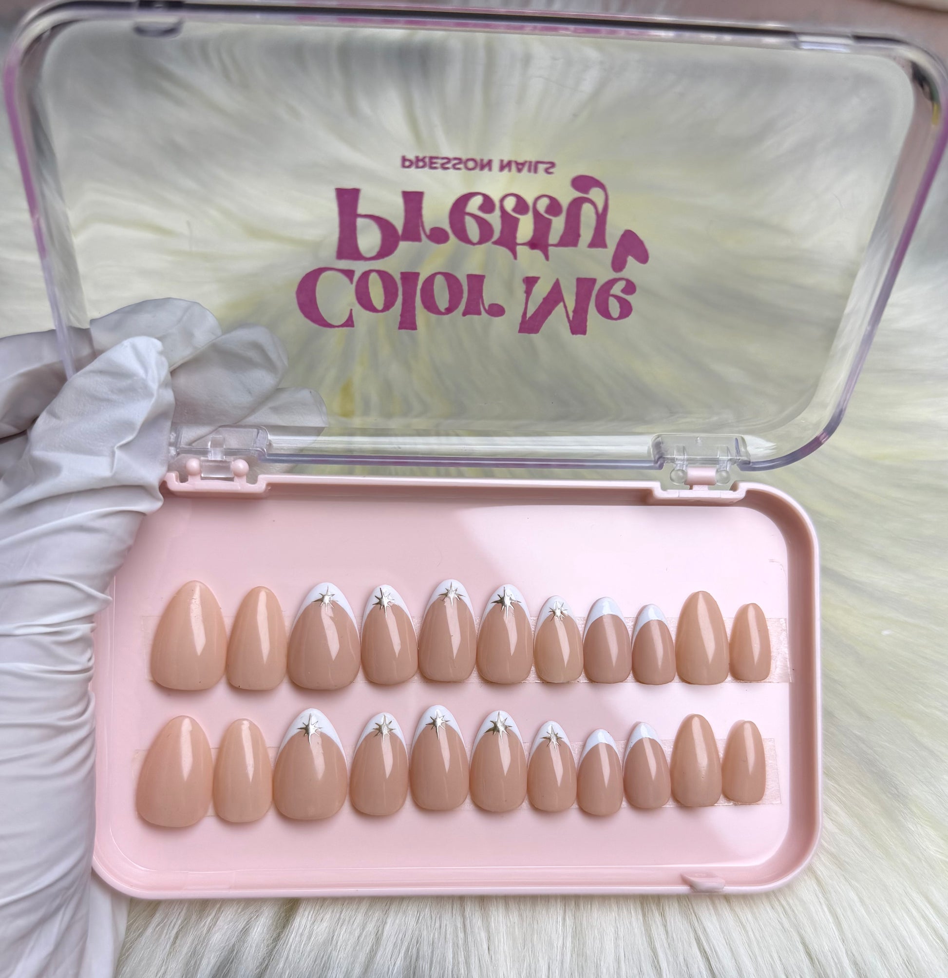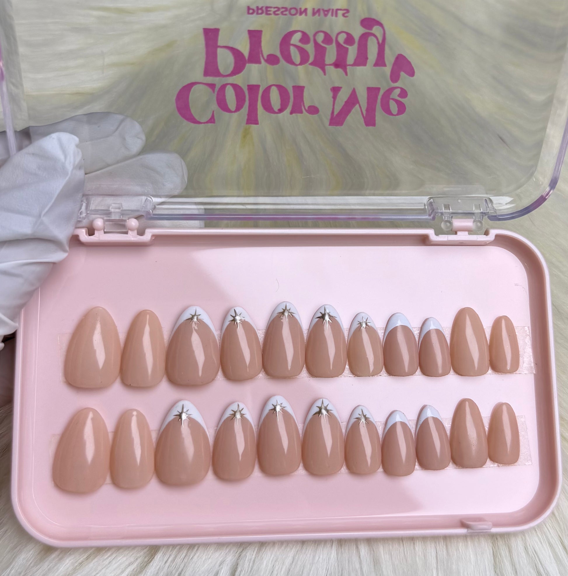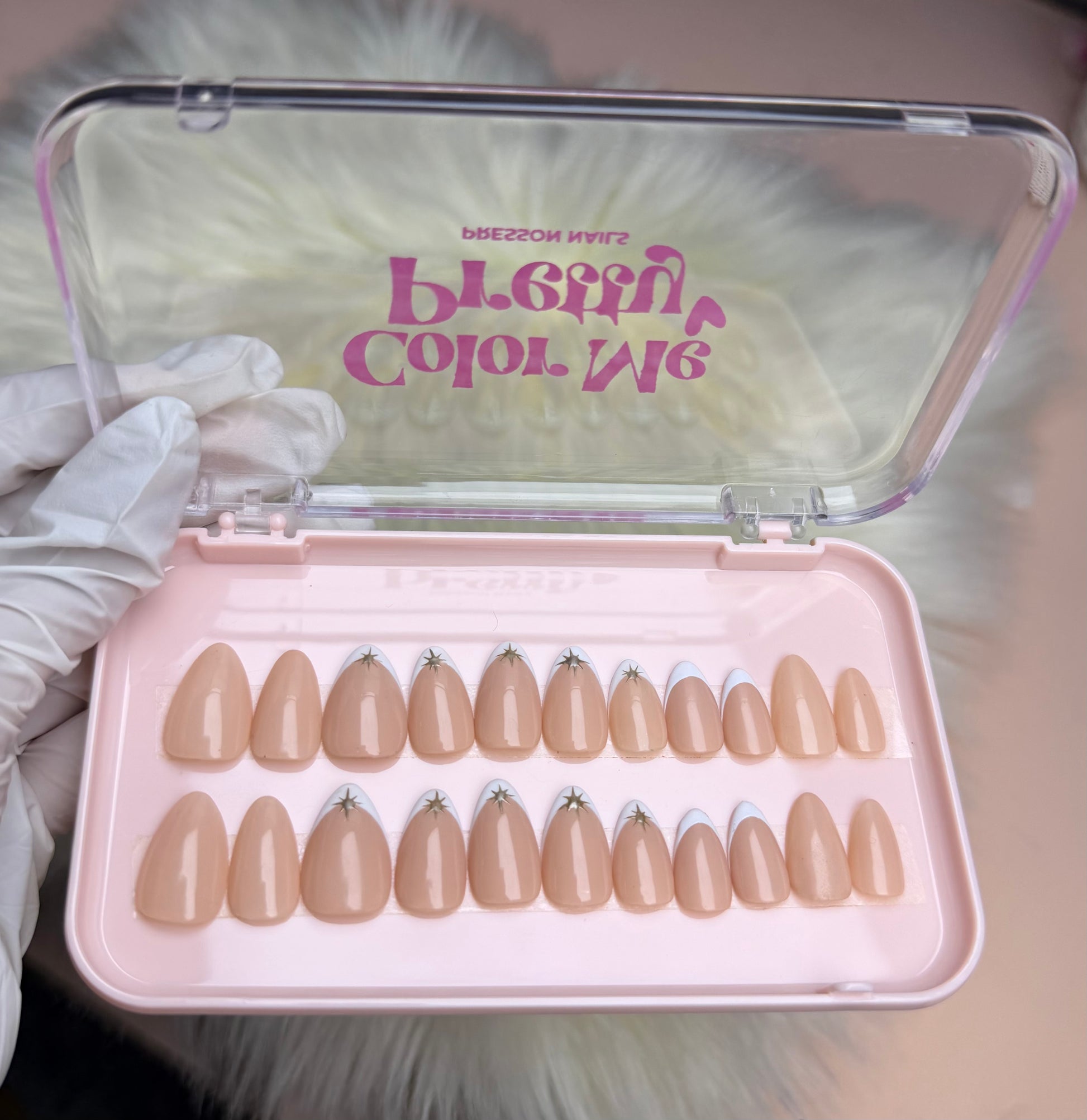 This minimal French set features a milky base highlighted with delicate star detailing. Clean lines and subtle embellishments create a soft, celestial aesthetic. Perfect for everyday elegance, these nails balance simplicity with artistic charm for a fresh, modern look.