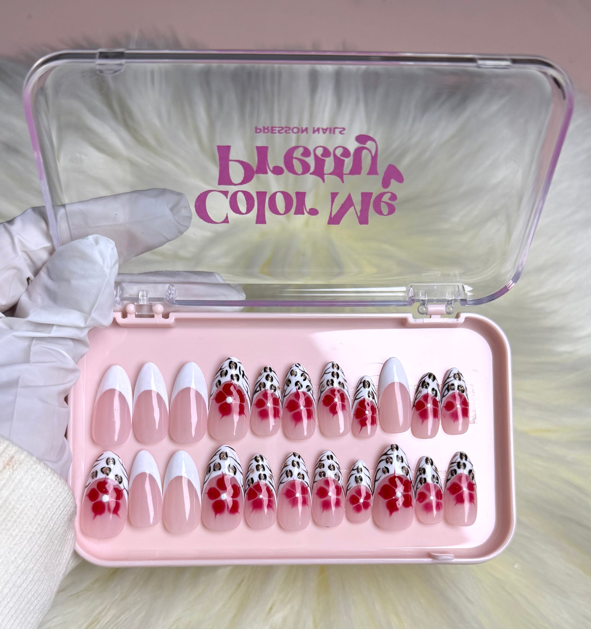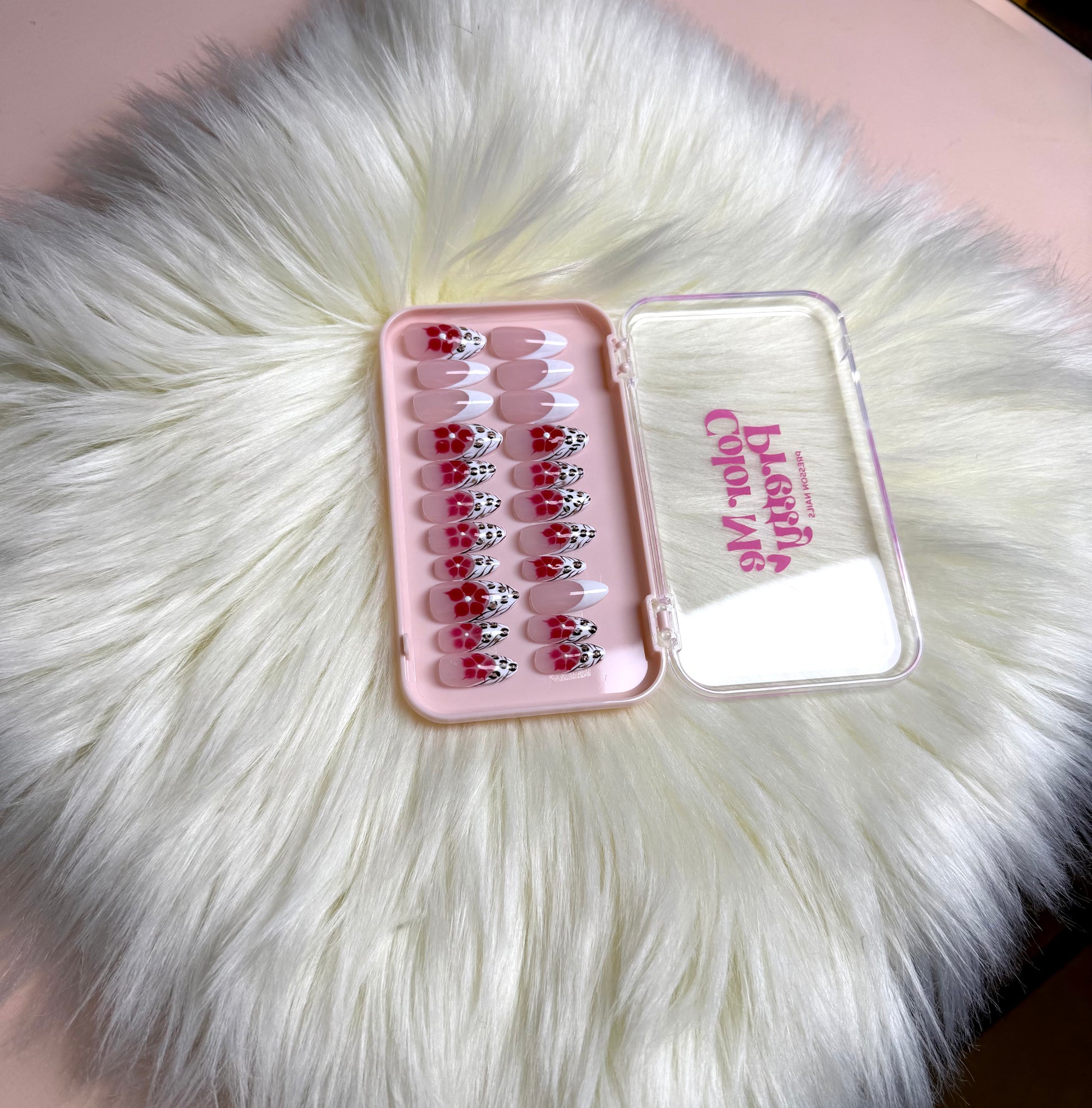 This elegant French set is enhanced with delicate blooming floral accents that add softness and movement to the design. Expertly crafted using blooming gel techniques, each nail carries a romantic charm while maintaining clean structure. Perfect for those who love subtle florals, graceful detailing, and timeless feminine beauty.