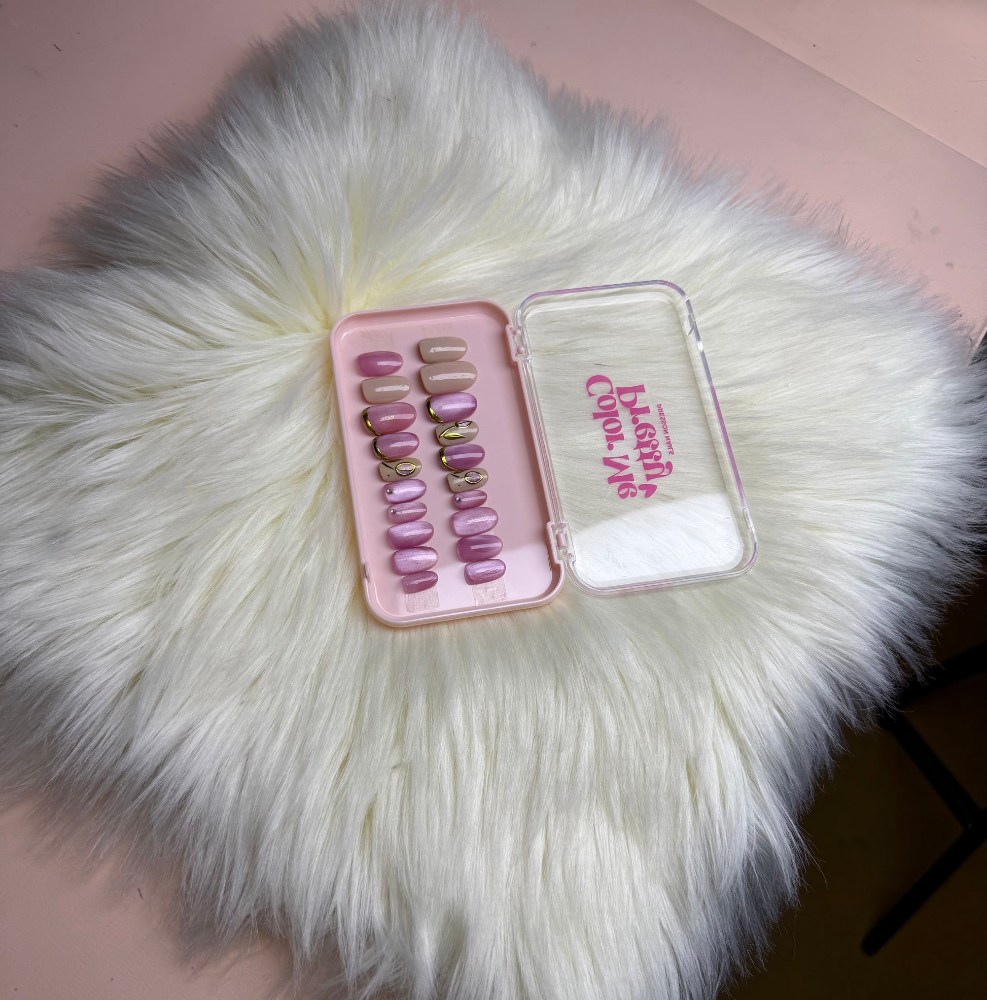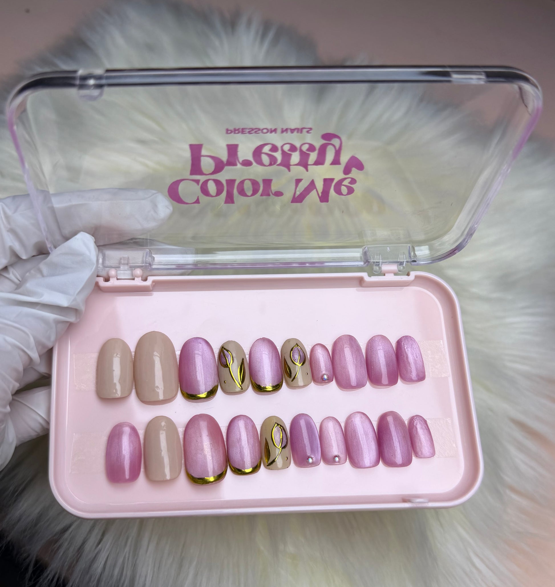 Soft rose tones meet opalescent chrome in this luminous set. The reflective finish shifts beautifully under light, giving a pearl-like glow. Crafted with precision layering, this design feels romantic, modern, and luxurious—perfect for those who love soft glamour.